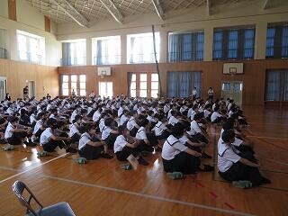 校長先生から、「自分や仲間を信じて最後まで戦ってほしい。特に練習(これまでの経験)を思い浮かべ、自分を信じた時に底力を出すことができる。三松中生徒の健闘を祈ります」とお話がありました。