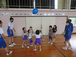 今日の交流学習は体育館と各教室に分かれ、生徒たちが班を編成してゲームをはじめ、折り紙や風船を使った遊びなどを企画し小学生と一緒に活動しました。小学生はお兄さん、お姉さんが来てくれたことに本当に喜びたくさん駆け回っていましたが、生徒たちも小学生の喜ぶ姿に笑顔がこぼれていました。とても楽しい時間を過ごすことができました。