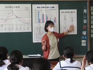 三松中学校では、先週1週間を「性教育週間」と位置づけ、学級活動の時間に、保健室の小松咲彩先生と学級担任の先生で、「性に関する授業」を行いました。