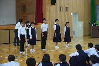 (旧全校専門委員長・副委員長のみなさん:(学習)永山真愛さん、前野伶衣奈さん (生 活)本村一馨さん、辻玖努さん (文化)津奈木勇輔さん、中窪真優さん (保体)髙牟禮亘希さん、今奈良弥生さん (給食)木上咲花さん、田中悠斗さん)