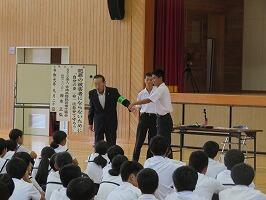 午後からの授業では、中学生との交流会で、生徒会から三松中学校の説明や全国いじめ問題子供サミットの報告を兼ねて、中学校でのいじめ問題の取組を紹介しました。