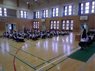 続いて、校長先生の話では、人間の「感性」について東洋大学が実施している「現代学生百人一首」で選ばれた短歌を紹介しながら、将来ロボットやAIが人間に代わって様々なことをしていくという予測がある中で、これからの時代は人間だけが持つ感性を豊かにしていくことが大切であることなどを生徒たちに語りかけました。