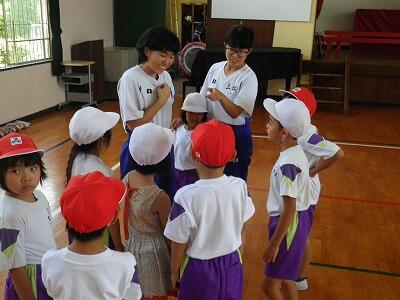 今日の交流学習は体育館と運動場に分かれ、生徒たちが班を編成してゲームをはじめ、なわとびや風船を使った遊びなどを企画し小学生と一緒に活動しました。小学生はお兄さん、お姉さんが来てくれたことに本当に喜びたくさん駆け回っていましたが、生徒たちも小学生の喜ぶ姿に笑顔がこぼれていました。暑い中でしたがとても楽しい時間を過ごすことができました。