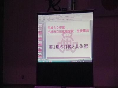 今日の諸活動の時間は生徒集会が開かれました。集会では「第1期の目標と具体策」について発表がありました。各委員会の目標は次のとおりです。