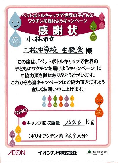 「ペットボトルキャップで世界の子どもにワクチンを届けようキャンペーン」を行っているイオン九州株式会社に届けました。