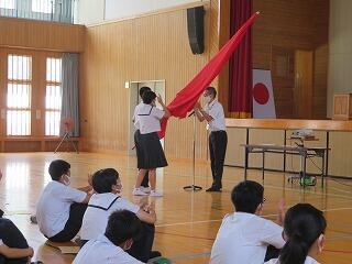 例年であれば、1年生と、2・3年生がそれこそ対面して行われるのですが、密閉、密接場面を避けるため体育館の窓を開け、また、生徒同士の間隔を空けて座って行われました。