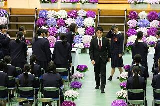 式辞の中で卒業生へのメッセージとして、相田みつおさんの「何も咲かない寒い日は、下へ下へと根をのばせ。やがて大きな花が咲く」という言葉を送りました。春になると華やかな花を咲かせる桜の木も、厳しい冬の寒さを堪え忍んではじめて美しい花を咲かせます。卒業生には、これから苦難に遭っても、成果がすぐに出なくても、「焦らず あわてず あきらめず」、目の前にあること一つ一つに挑戦し、自分らしい夢の花を咲かせて欲しいと思います。がんばれ 卒業生!!