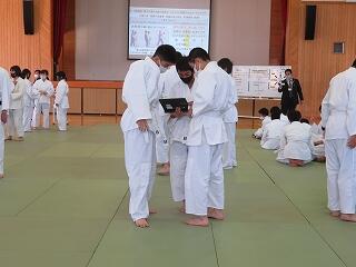 11月26日(金)には、研究内容の発表として県内各地から70名ほどの先生方に参加していただき、授業公開を行いました。今回は、黒木主幹教諭が1年B組で理科、岡上教諭が2年A組で保健体育、押領司教諭が3年B組で英語の授業をそれぞれ公開しましたが、各授業において生徒が主体的に活用する場面が見られました。