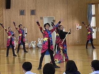 『VENTURES』は、マーチングバンド全国大会で今年度21回目の金賞を受賞されており、県内外だけでなく海外での演奏活動を展開されているバンドです。生徒さんたちの行動もきびきびとしていて礼儀正しく、演奏準備から後片付けまで洗練された無駄のない動きで、見ている私たちを圧倒し、感動を与えてくださいました。感染症対策で学年を2つに分けたため、2回講演となりましたが、遠方から朝早く出てきている疲れを感じさせないパワフルなステージでした。