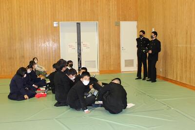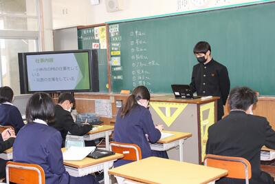 2年生は、2時間続きで前半に立志の集い、後半に職場体験学習の発表を行いました。立志の集いでは、自分が選んだ今後の生き方の指針となる言葉を習字にしたため、一人ひとり堂々と発表することができました。職場体験学習の発表は、体験先のグループに分かれ、仕事内容の説明や学んだことなどをパワーポイントを利用して分かりやすく説明していました。保護者向けにはQRコードを用意し、スマートフォンで読み込んで手元でプレゼン資料を確認してもらう工夫をしていました。