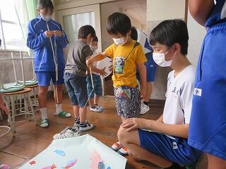 今日の交流学習は体育館と各教室に分かれ、生徒たちが班を編成してゲームをはじめ、折り紙や風船を使った遊びなどを企画し小学生と一緒に活動しました。小学生はお兄さん、お姉さんが来てくれたことに本当に喜びたくさん駆け回っていましたが、生徒たちも小学生の喜ぶ姿に笑顔がこぼれていました。とても楽しい時間を過ごすことができました。