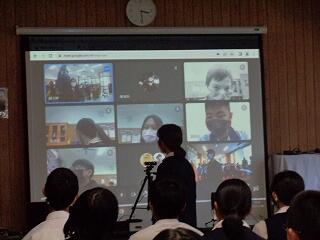 市の取組として、三松中学校が台湾の三星中学校との交流授業を英語の時間に行うもので、10月に引き続き、今回が2回目の交流となりました。前回は本校の3年生と三星中学校の1年生との交流でしたが、今回は本校1年生と三星中学校2年生との授業となりました。1年生担当の長野教諭がより相手に伝わりやすい交流にするために、プレゼンに文字を入れて、発表の後にすぐ質問する形式をとりました。1年生の代表の生徒たちは、カメラに向かって堂々と大きな声で自分が紹介したいことについて英語で説明し、三星中学校の生徒たちも臆することなくカメラの前に出てきて大きな声で質問したり、答えたりしてくれました。