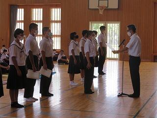地区分散または県一括で行われた中学校総合体育大会の校納・表彰式が行われました。