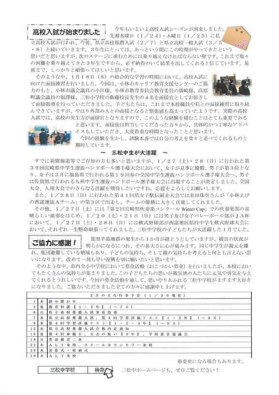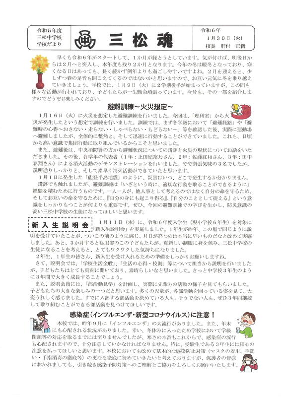 学校だより『三松魂」1月30日号を掲載しました