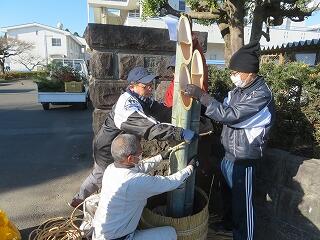 18日(土)に、「おやじ学級」で門松づくりを行いました。おやじ学級生と職員併せて11名で正門前に門松を設置しました。