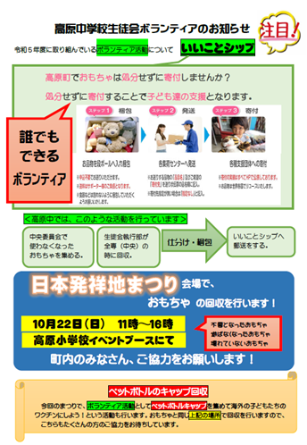 4月以降生徒会活動として、不要となったおもちゃの回収を行ってきましたが、10月22日(日)に行われる『日本発祥地まつり』で「おもちゃ」と「ペットボトルのキャップ」の回収を行うこととなりました。ご自宅に壊れてなく不要なおもちゃがありましたら、ご協力をよろしくお願いします。まつり会場に回収箱を設置いたします。
