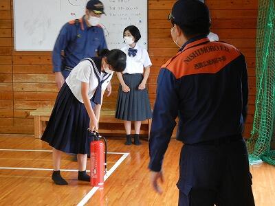 6月21日(水)の5校時に火災における避難訓練を実施しました。火災のDVDを視聴したり、高原町分遣所の方の講話を聞いたり、消火器を使った消火訓練を行ったりしました。また、屋内消火栓や防火シャッターについても学習しました。火災の場合は、煙を吸わない、煙を吸わせないを心掛けましょう。
