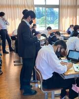 今年度、高原中学校は「ICT活用推進モデル校」に指定されており、タブレットを活用した授業に取り組んでいます。