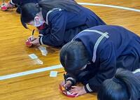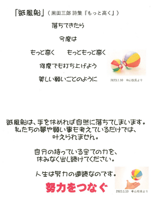 校長先生のお話の中で、生徒全員で紙風船に夢や希望、目標を記入し、みんなで打ち上げました。繰り返し、努力を続けていかないと夢を実現することは難しいということを体験しました。
