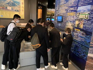 2年生の修学旅行団は、無事に下船し、がまだすドームで火山の災害について学習しました。「がまだすドーム」はジオ(地球)と火山の体験ミュージアムで雲仙岳の噴火の歴史や災害について学習できる施設です。がまだすとは方言でがんばるという意味だそうです。子どもたちは、平成大噴火シアターと島原大変劇場をみて、館内を見学しました。