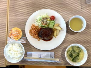 1年生の宿泊体験学習は、創作活動を終え、写真撮影とレクリエーションを行いました。そのあと、最後の昼食をとりました。メニューはごはん塩焼きそば、シュウマイ、鳥の唐揚げ、ハンバーグ、スープ、野菜サラダでした。みんな美味しくいただきました。