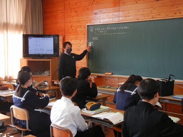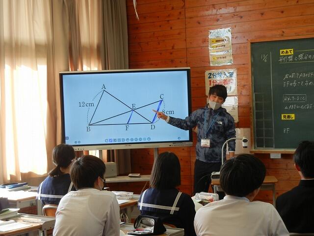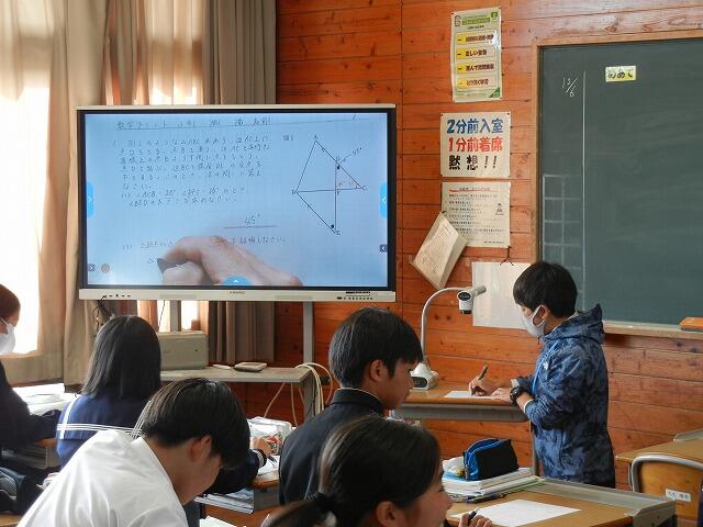 12月6日(水)の4校時は数学科のT先生とN先生の校内研修の一環の1人1研究授業が行われました。T先生の授業は「平行線と線分の比」、N先生の授業は「図形と相似」の単元で行われました。電子黒板、実物投影機、タブレットを使った授業を展開しました。