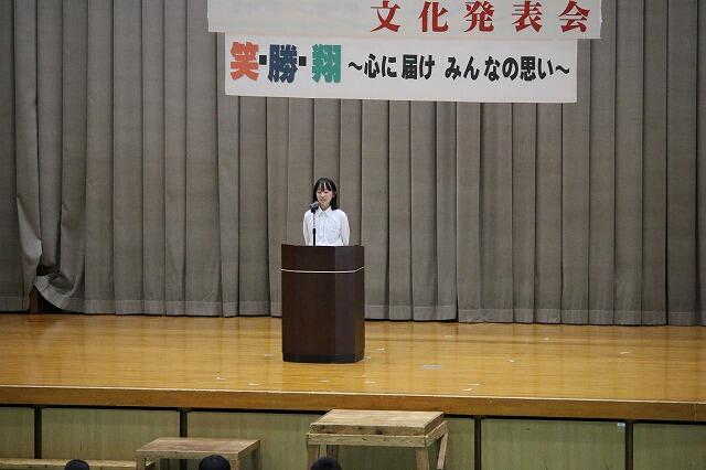 10月25日(金)に文化発表会が開催されました。当日は、吹奏楽部の演奏、日本語弁論、英語弁論、茶道部の発表、合唱コンクールが行われました。また、展示発表として、修学旅行のまとめ、高校調べ、書道、美術の作品等の掲示がありました。合唱コンクールでは、どのクラスも学級ごとに練習してきた成果を出したすばらしい合唱を聞かせてくれました。