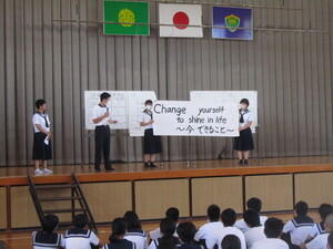 中体連やサマーコンサートの表彰もありました。行事のたくさんある時期になります。やるべき事をしっかりと頑張ってほしいと思います。