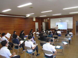 7月15日に部活動の部長等・職員が集まり、合同で救急救命研修がありました。AEDの使い方や胸骨圧迫の方法、実際倒れた場合のシュミレーション、熱中症について等、実践的な研修を行いました。みんな真剣に取り組んでいました。