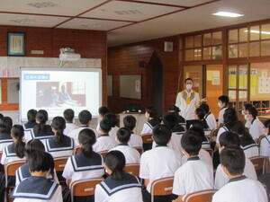 7月7日に小林市出身の山下先生の講話がありました。先生は、東京都立高校で数学を教えておられましたが、2019年にJICAの青年海外協力隊の一員として南アフリカに派遣されていました。しかし、新型コロナウイルス感染症拡大をうけ、今年、3月に日本へ帰国し、現在、再派遣待ちの状態だということです。その期間を利用し、ボランティアで本校1年生の数学をT・Tで教えて下さっています。山下先生に南アフリカの事や自分にできることを実行することの大切さ等について、楽しく話をしていただきました。生徒たち興味をもって話を聞いていました。先生が言われたように自分にできることを実行できるようになれるといいですね。