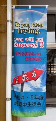 生徒会が新体制になってから約3ヶ月が経過しましたが、新しいのぼり旗を3種類準備し、生徒玄関に掲げています。「あたり前のことを当たり前に~」をモットーに、カラフルでかっこいいデザインとなっています。