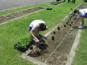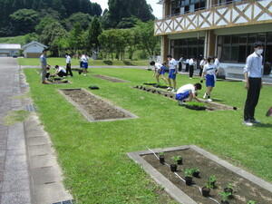 6月8日、9日に生活美化委員が、花壇に花の苗を植えました。梅雨の合間で天気も良く、暑い中での作業となりましたが、用務員さんが育ててくださった苗を子どもたちは一生懸命に定植しました。きれいな花が咲くことだと思います。