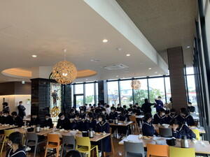 2年生の修学旅行団は、長崎カステラランドの海の見えるレストランにて昼食をとりました。今日のメニューは、ハンバーグ定食でした。今日は天候が悪く海はきれいに見えなかったようですが、おなかはいっぱいになったのでは?
