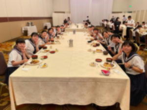ホテルについて、入館式を行い、各部屋に入りました。その後、夕食となりました。本日の夕食はなんと大きいとんかつです。コロナの関係で、前の人との距離は約2m、広い会場での夕食でした。この後、入浴を済ませ、22:00消灯となります。