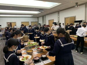 2年生修学旅行団は、講話を終え、夕食となりました。今日の夕食はなんとバイキングでした。好きな物を好きなだけ食べれるので、満足だったと思います。感染拡大防止のために、みんなポリ手袋を付けて、料理を取っていました。