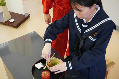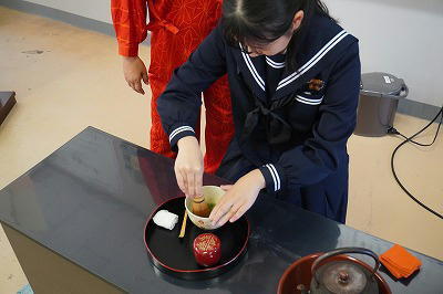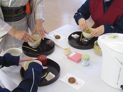 2月19日と27日に茶道教室を行いました。高原中の茶道部を指導されておられる先生に来校いただき、茶道の歴史や心遣い、所作等を教えていただきました。所作一つ一つに意味があり、最初はぎこちない感じでスタートしましたが、スムーズにお茶を点てることができるようになっていました。貴重な経験をさせていただいたと思います。お忙しい中、教えていただき、ありがとうございました。