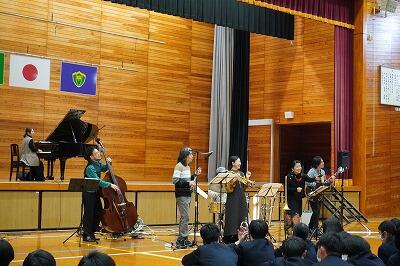 12月9日に中中連携で高原中学校に行きました。午前中は、面接の練習を合同で行いました。上手に受け答えができたようでした。さすがです。給食を食べて、午後からは合同で鑑賞教室がありました。今回は宮崎ジャズコネクションの皆様がジャズの名曲を披露してくださり、軽快なリズムと楽器の音色に魅せられました。また一つ貴重な体験ができましたね。