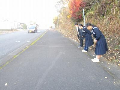 12月12日は、今年最後のあいさ2運動でした。寒い朝でしたが、元気にあいさつができました。後方の小学校の校庭にサネカズラの実がたくさん見れました。