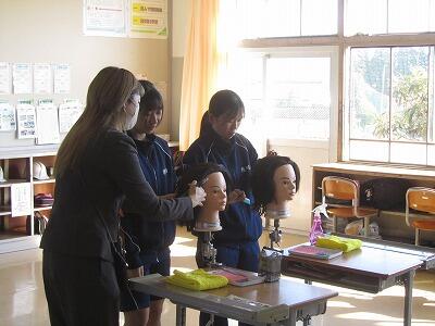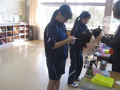 12月18日に宮崎県専修学校各種学校連合会のワーキングスタディの一貫として、宮崎サザンビューティー専門学校の2名の先生に来校いただき、美容体験学習を行いました。髪のとかし方やパーマロッドの巻き方、ヘアアレンジの仕方等について実演と実技の演習をしていただきました。子どもたちも興味が高い内容で、熱心に取り組んでいました。最後はお互いにヘアアレンジをしてきれいにしあげていました。今回もまた、貴重な体験となりました。お忙しい中ありがとうございました。