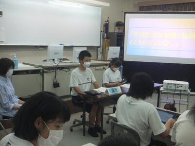 9月30日(金)の6校時は、『校則を考える会』の第4時間目(最終の授業)でした。今回は、『学校生活は制服と私服のどちらがよいか。』という議題で、『ディベート』を行いました。制服派と私服派それぞれの説明後、質問タイムに入りました。そして、作戦タイムをとり、反論という流れでした。最後は、校則がある理由や意義について自分の考えをまとめ、振り返りをして終了しました。中には、普段では見ることのできないみなさんの姿などが見られました。お疲れ様でした。(校長:鎌田浩二)