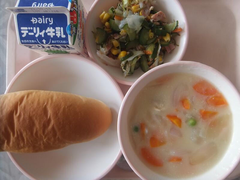 9月29日(木)の給食は、『旬の食材』でした。本日のメニューは、『牛乳・コッペパン・秋のクリーム煮・元気サラダ』でした。秋のクリーム煮には、秋が旬のさつまいもやしめじがたくさん入っていました。おいしかったです。秋を感じることができました。(校長:鎌田浩二)