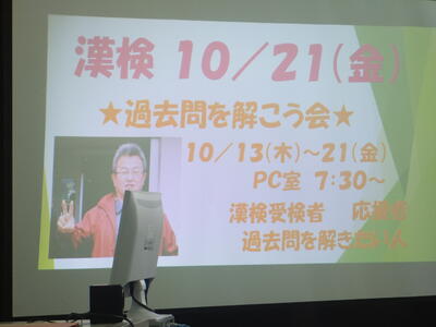 『漢検』にむけての学習が始まります。『あれー、写真には国語科の先生でなく英語科の先生が写真に写ってます。』頑張りましょう。
