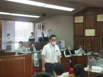 ※西田教育長が答弁しています。後には議長の西村優輝さんが座っています。