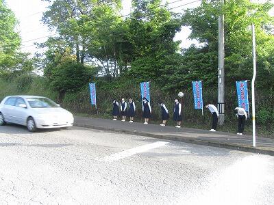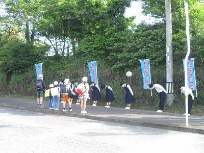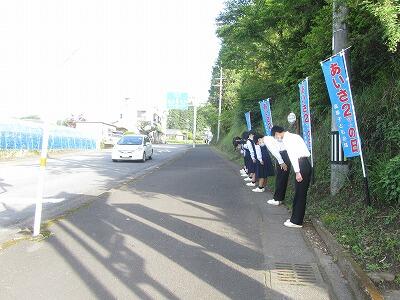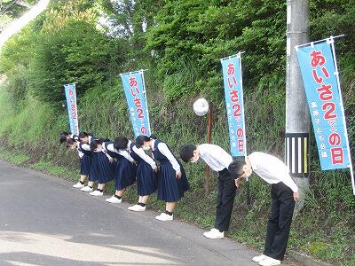 5月10日(金)は、あいさ2運動でした。天気は晴れで、放射冷却現象により朝は少し肌寒いくらいのすがすがしい朝となりました。そのような中、全校生徒で、地域のみなさま方にあいさつを行いました。