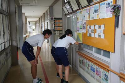 9月13日(水)、今日は午後から小雨が降ってきました。昼休み校内をまわると、1・2年生は、明日から久しぶりのテストとあって、教室や職員室で勉強している人が多いようです。心の中で「頑張れ!」とささやきながら戻ると、3年生は、3人で掲示板に夢中です。3年生は、1・2年生に比べて試験が多いので、もう余裕でしょうか?いずれにせよ、明日からのテスト頑張って欲しいですね。