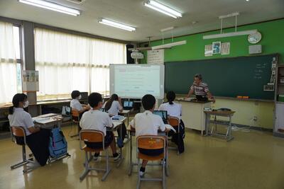 6月9日(金)、今週の水曜日に高原中学校で交流学習がありました。この日は、1時間目の授業が終わった後に、貸し切りバスに乗って全校生徒で高原中学校に行きました。それぞれの学年に分かれて学級に入りました。初めは慣れずに緊張している様子でしたが、授業に参加する中で、お互いに話しをする場面もあり笑顔が見られるようになりました。少人数の本校にあって、貴重な体験ができたようです。