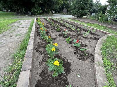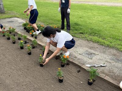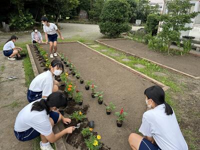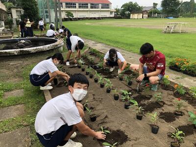6月21日(水)、昨日放課後、学校花壇に花の苗を生徒全員で移植しました。種から大切に育てられた苗(マリーゴールド、サルビア、センニチコウ)です。今日の雨で、すくすくと育っているようです。これから、夏にかけて咲きほこっていきます。大切に育てて欲しいです。