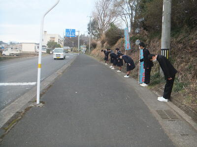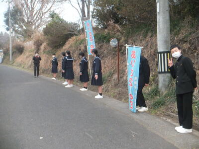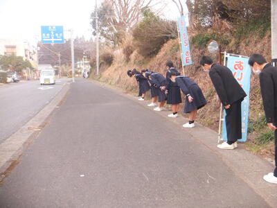 本日:2月2日(木)は『あいさ2運動』でした。『推薦・連携型入学者選抜検査』のため、全員はそろいませんでしたが、学校近くの歩道から登校する小学生や行き交う車のみなさんにあいさつをしました。みなさまからもあいさつを返していただき気持ちのよいスタートとなりました。(校長:鎌田浩二)