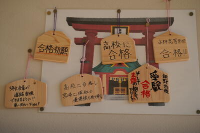 先日、教室を回っていると、3年生の教室に『絵馬』を発見しました。『絵馬』は技術の時間に制作したそうです。立派な『絵馬』です。自分の夢を勝ち取ってください。(校長:鎌田浩二)