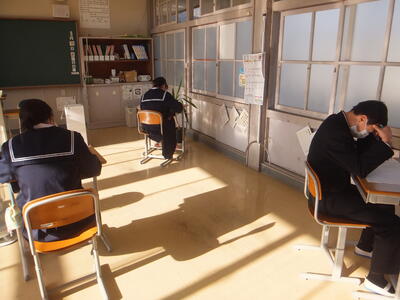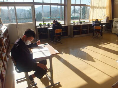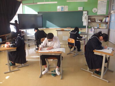 本日:1月12日(木)と明日の2日間、1・2年生は『実力テスト』、3年生は『学力診断テスト』を行っています。みんな、集中して取り組んでいました。3年生は、今月末から私立高校の入試が始まります。志望校に合格できることを期待します。(校長:鎌田浩二)